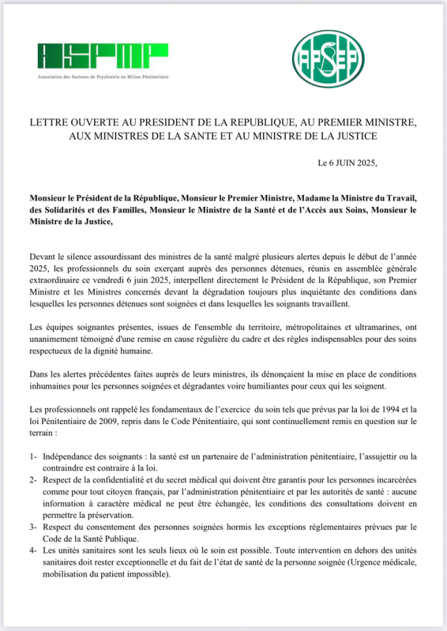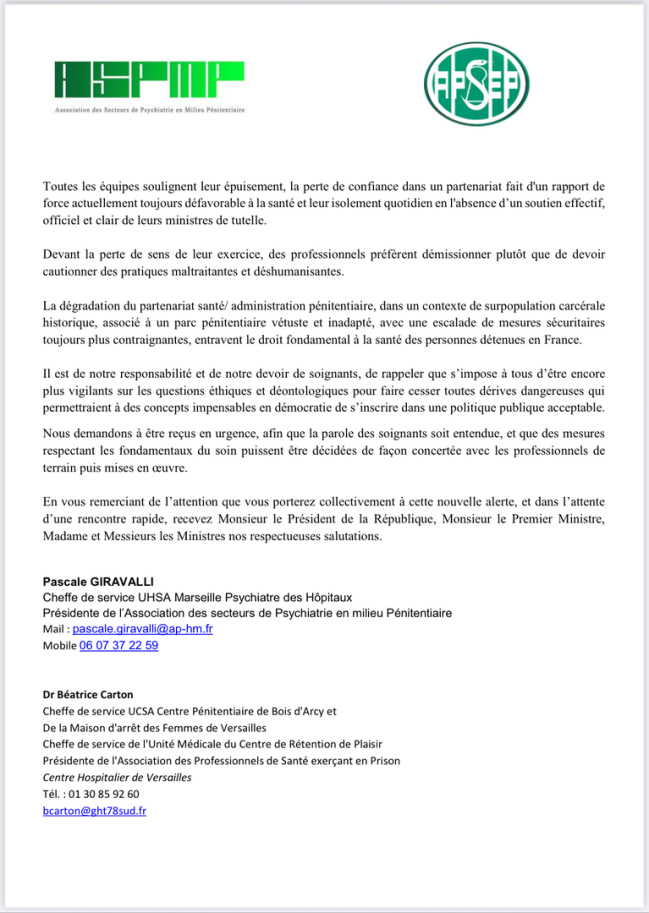 Le Syndicat de la Magistrature (SM), Le Syndicat des avocats de France (SAF), l'Union Syndicale de la Psychiatrie (USP), l'Association des secteurs de psychiatrie en milieu pénitentiaire (ASPMP), la CGT.
